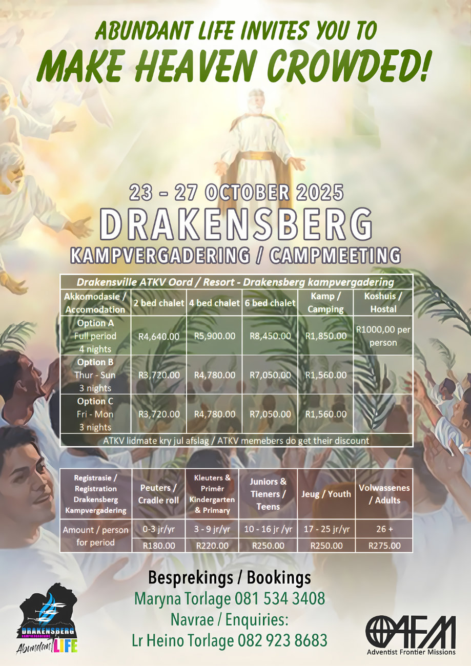 Drakensberg kampvergadering is vir baie die hoogtepunt van die jaar. Met plaaslike en internasionale sprekers wat preke en seminare aanbied, is daar baie om van te kies en nooit ‘n vervelige oomblik nie. Spandeer tyd saam met vriende en familie in die pragtige Drakensberg-omgewing, en bereik nuwe geestelike hoogtes saam met Jesus. Moenie vanjaar se kampvergadering misloop nie!